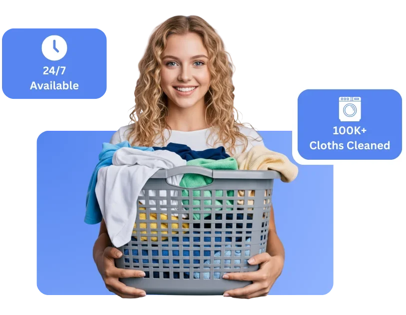 Woman holding a basket of clean clothes with text showing 24/7 laundry service and 100K+ clothes cleaned.